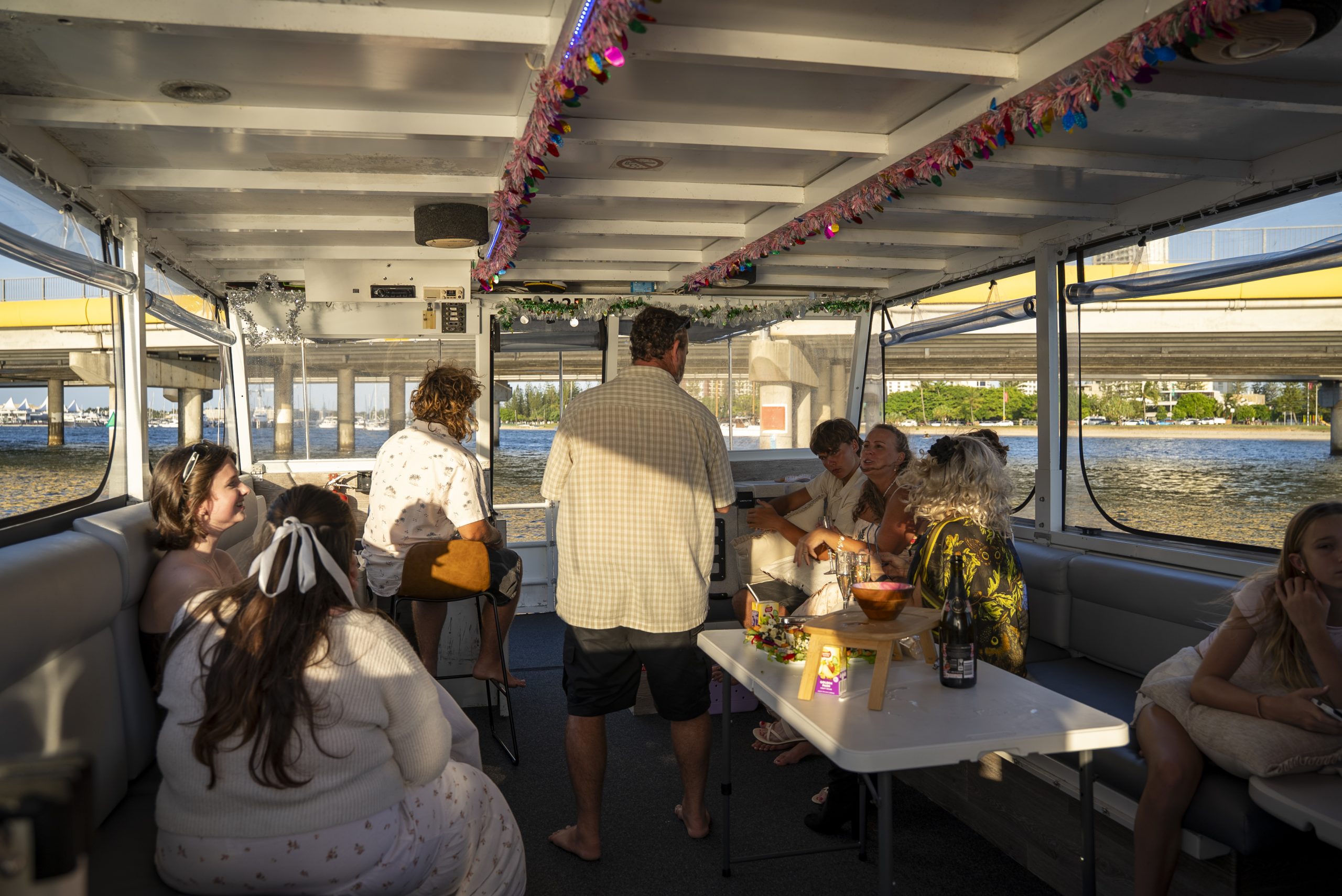 Designated spacious deck areas and comfortable seating arrangements on the Party Cruise Boat for simple socialising , sunbating, reading and enjoying the scenery.